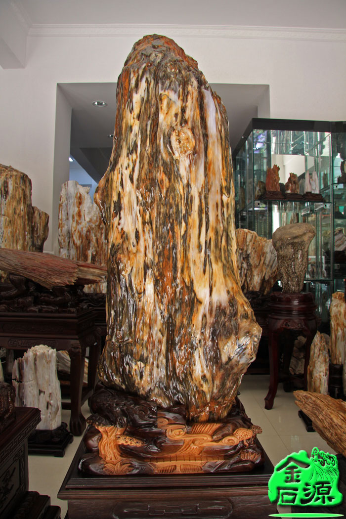 金至尊树化玉推荐产品之NO.3888国色天香:本产品稀世之宝老坑料,全面精工,种水透明,色泽亮丽.精妙绝伦.色彩迷人,蓝色飘花带鸡血红,有几个明显的树节,造型圆润透明,纹理清晰,景色怡人!仿佛像一幅山水画一样。收藏顶级品。很难得的一件极品宝贝,适合厅堂及公司摆设,另配送高档底座。