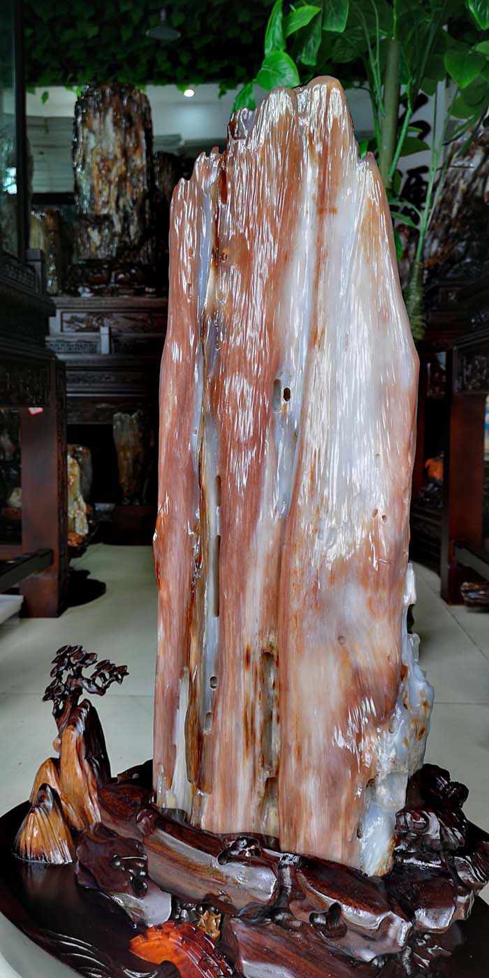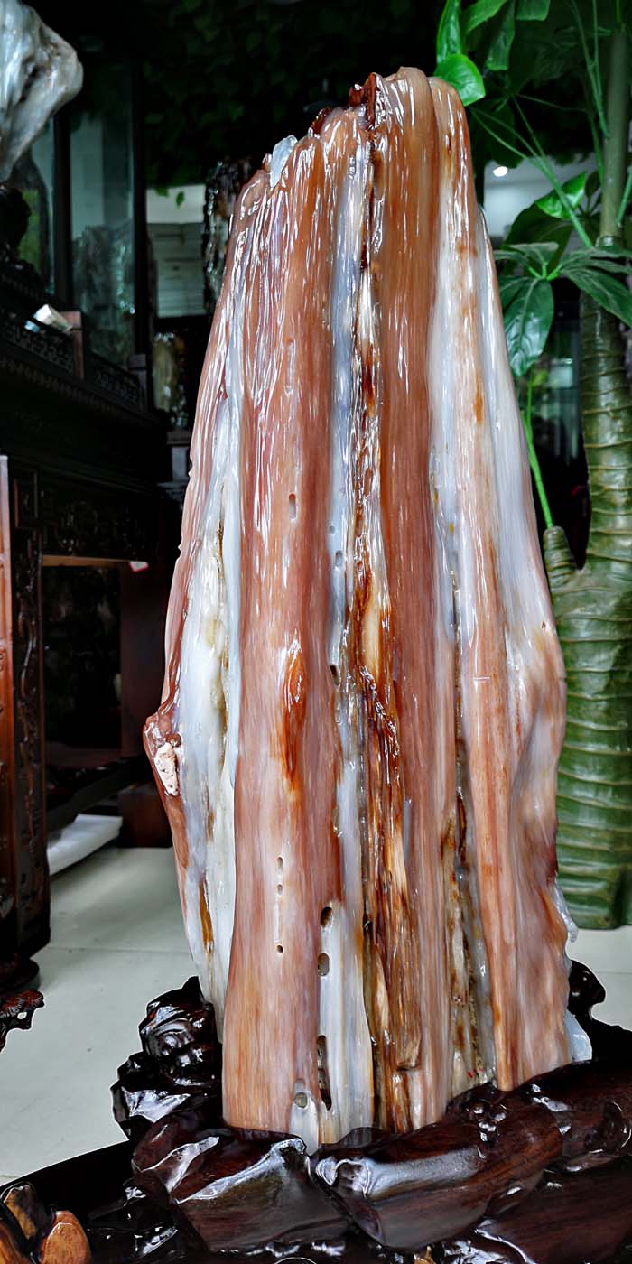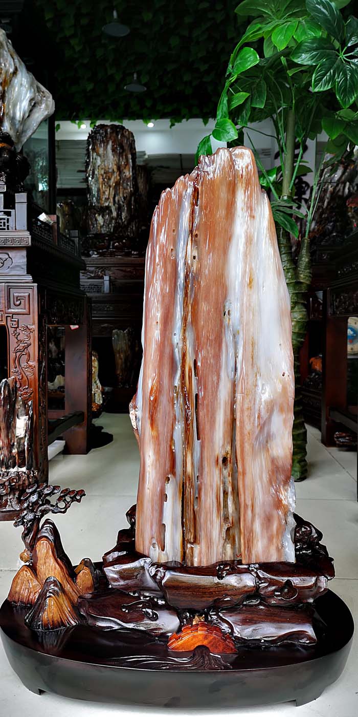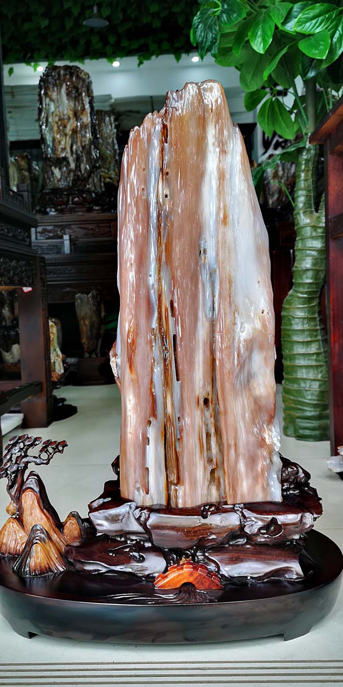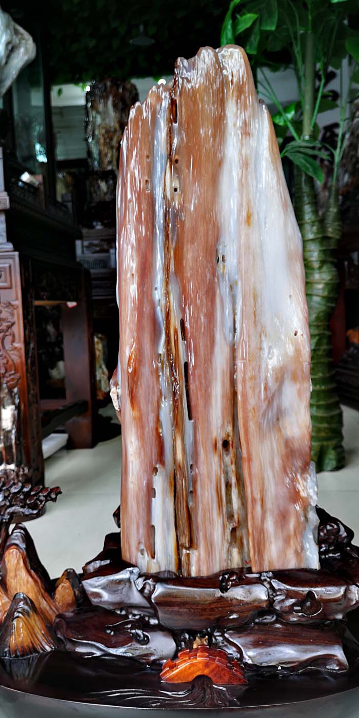 老坑冰种缅甸树化玉,玉化透,色彩清爽干净。山峰形状自然完美,有山有水此宝贝作为镇宅或摆放办公桌上。玄关,客厅转运招财的风水石首选,寓意生意兴隆,财源滚滚,事业兴旺。事业顺风顺水。配送红木材质精雕花底座